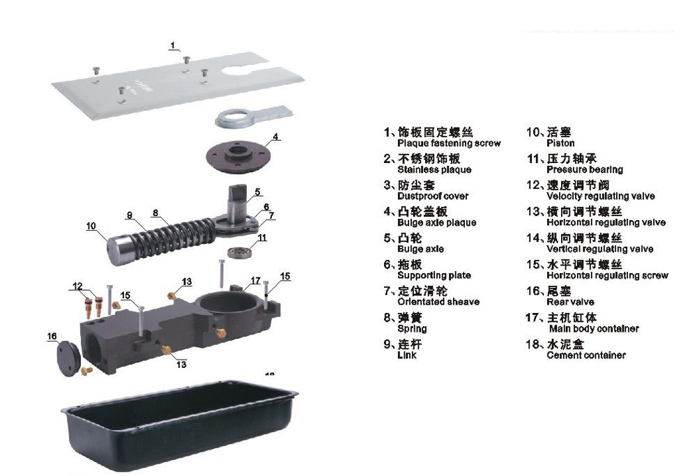 地彈簧是一種液壓式閉門器,只不過其壓緊彈簧的裝置是蝸輪而不是齒輪、齒條。因?yàn)槲佪喛梢哉聪蛐D(zhuǎn),所以地彈簧可以用于雙向開啟的門,而閉門器則只能用于單向開啟的門。地彈簧的技術(shù)關(guān)鍵是主軸下部的承重座,它決定著地彈簧的承重等級(jí)。