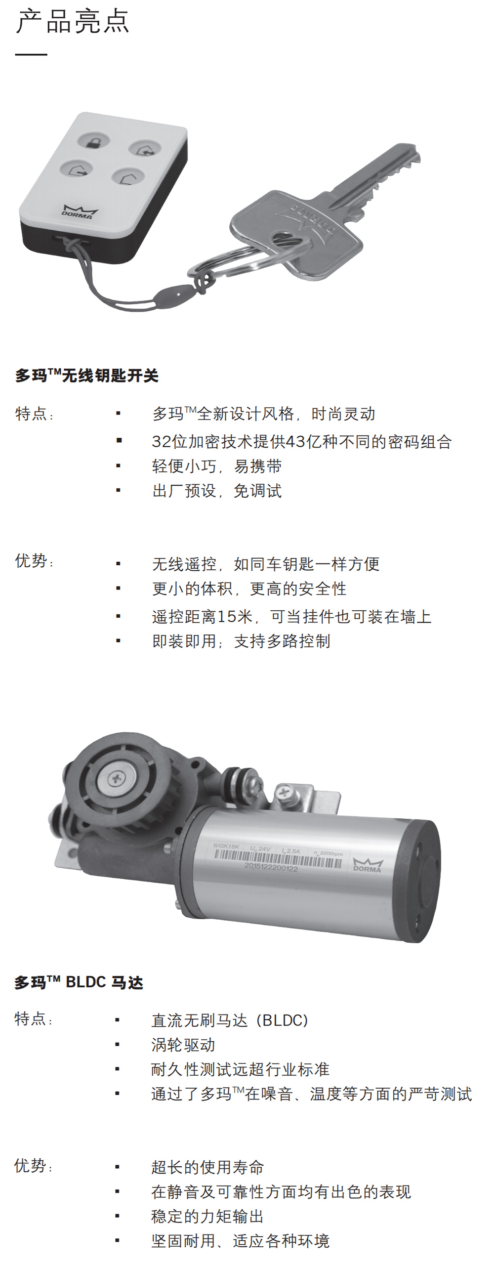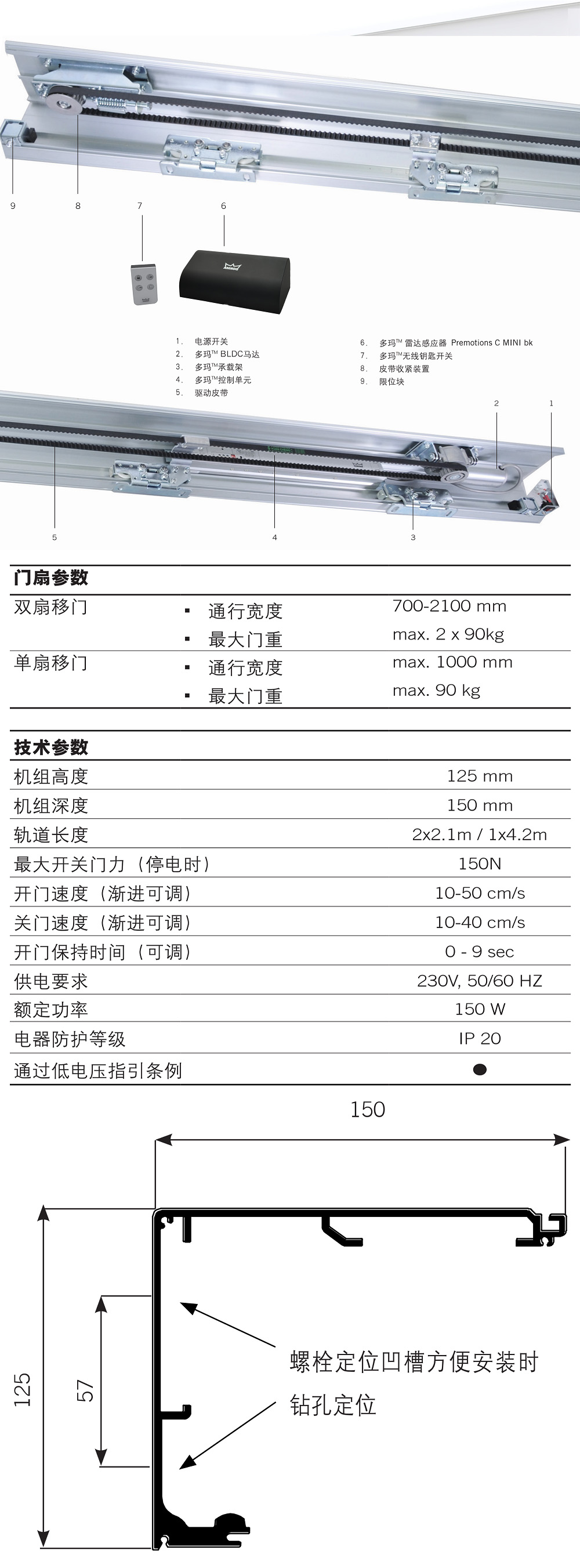 DK90自動(dòng)門,承重雙扇2*80公斤,單扇90公斤,通行寬度700-2100mm。這款自動(dòng)門機(jī)組經(jīng)濟(jì)實(shí)惠、安裝簡(jiǎn)單、故障率極低,最大的亮點(diǎn)是多瑪自動(dòng)門第一次標(biāo)配了一款超級(jí)漂亮的遙控器。多瑪作為全球領(lǐng)先的門控解決方案供應(yīng)商,專為新興市場(chǎng)開發(fā)了這款升級(jí)版的自動(dòng)平移門產(chǎn)品:DK 90平移門驅(qū)動(dòng)裝置。